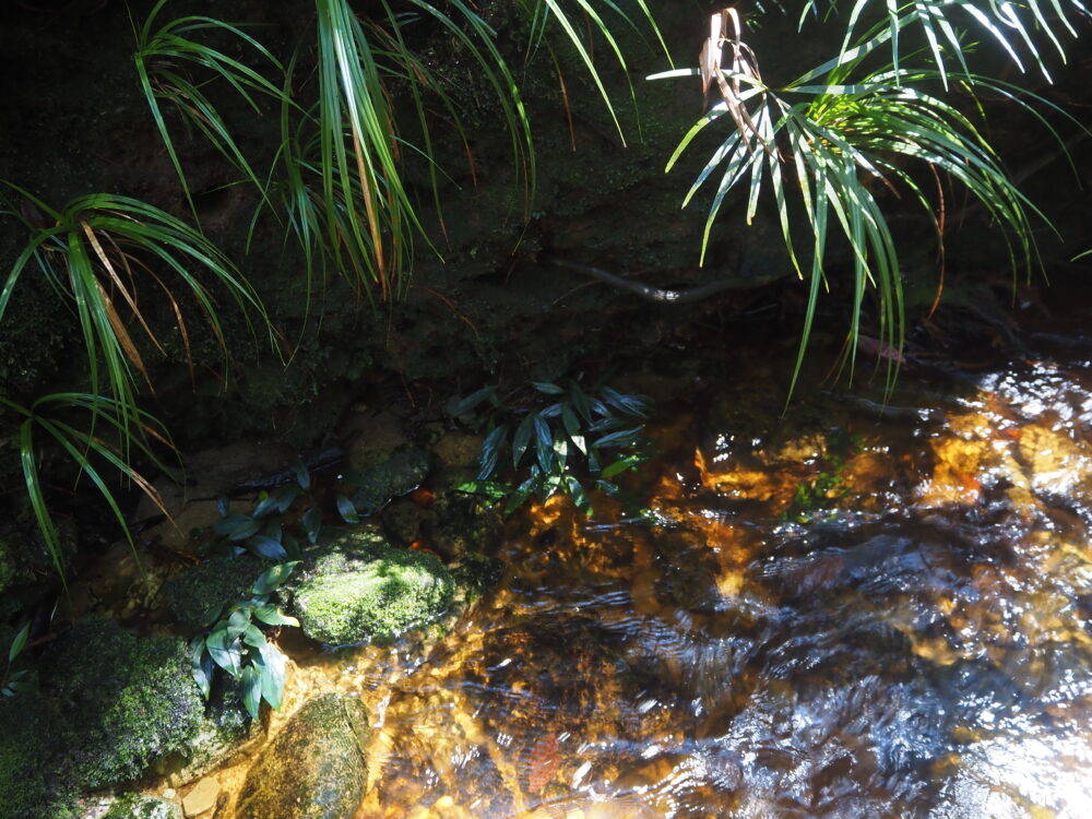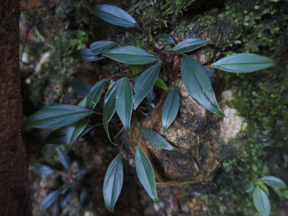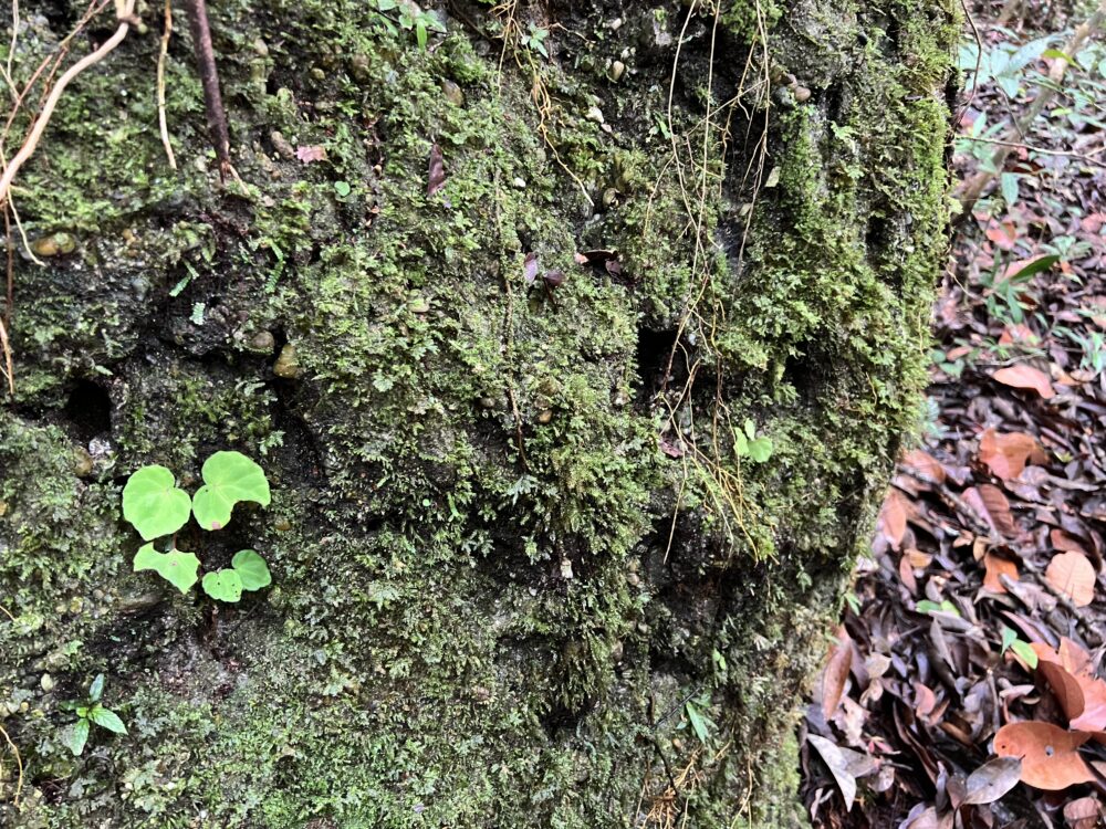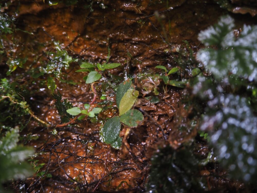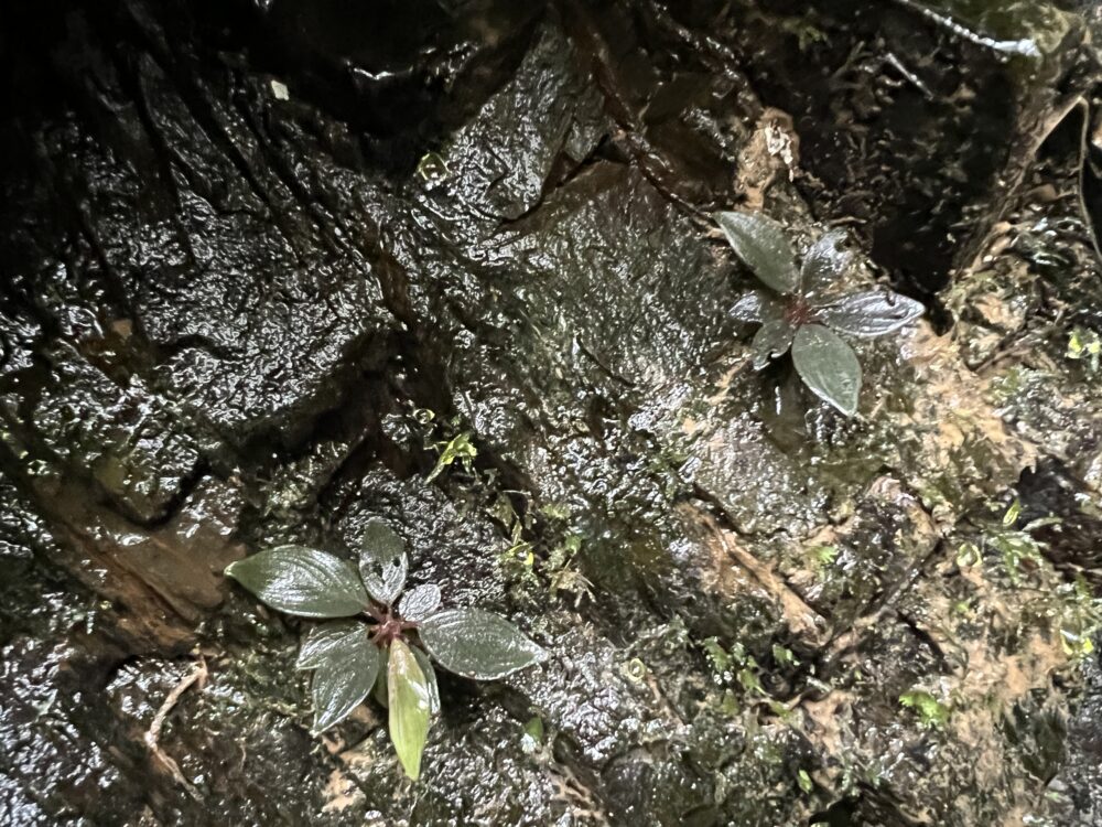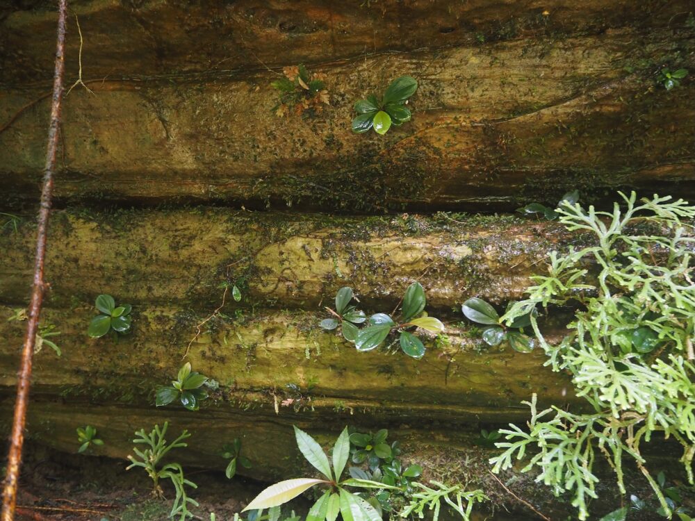 ここはベゴ確ポイントですね。もう絶対にそこにいます。イワタバコも各岩に必ず出現します。雨と朝露と湧き水で毎日濡れるけど、毎日ちゃんと乾く場所で、色々な堆積物や苔シダに覆われて栄養分も途切れず小型植物にとっては競争の激しいポイントでもありますが、岩盤上なので深く根を張る必要がある大きい植物は生活できないようです。