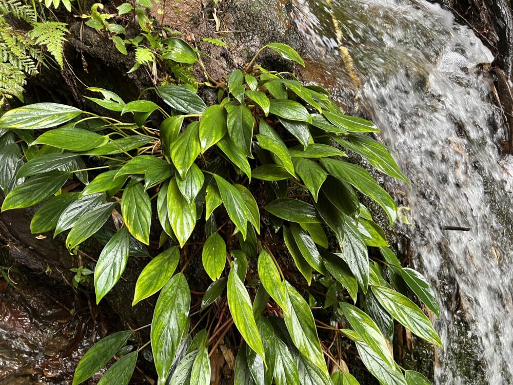 低い滝の裏は高湿度+水飛沫+低光量の環境で、ここにもHomalomenaが他の植物から離れて群生していることがあります。