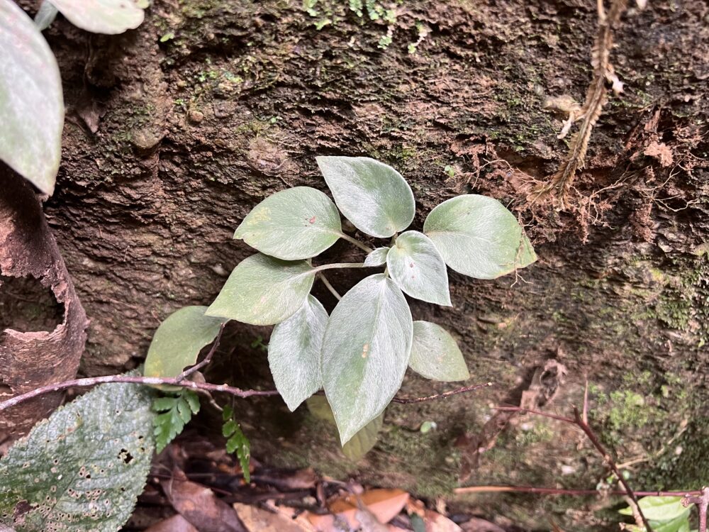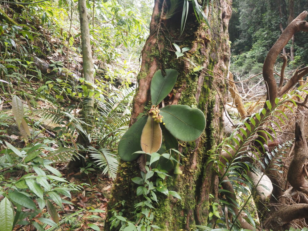 物理的な巨大な板根が放射状に広がることで、地面に「仕切られた小部屋」のような空間が生まれ、空気を停滞させるため周辺よりも湿度が高く保たれます。さらに枯れ葉などの堆積物が隙間に集まり厚い層になって、植物にとって良質な苗床になります。水捌けが良い場所ではここにフミリスタイプの天鵞絨ホマが点在していたり似た生態のスキスマが居たりします。逆に水が一時的に溜まるような水気の多い場所では苔やジュエルオーキッドが多く見られ、その上にコケシノブの大群生が形成されていたりします。この環境を再現できれば大体の小型Aroidは育てられます。