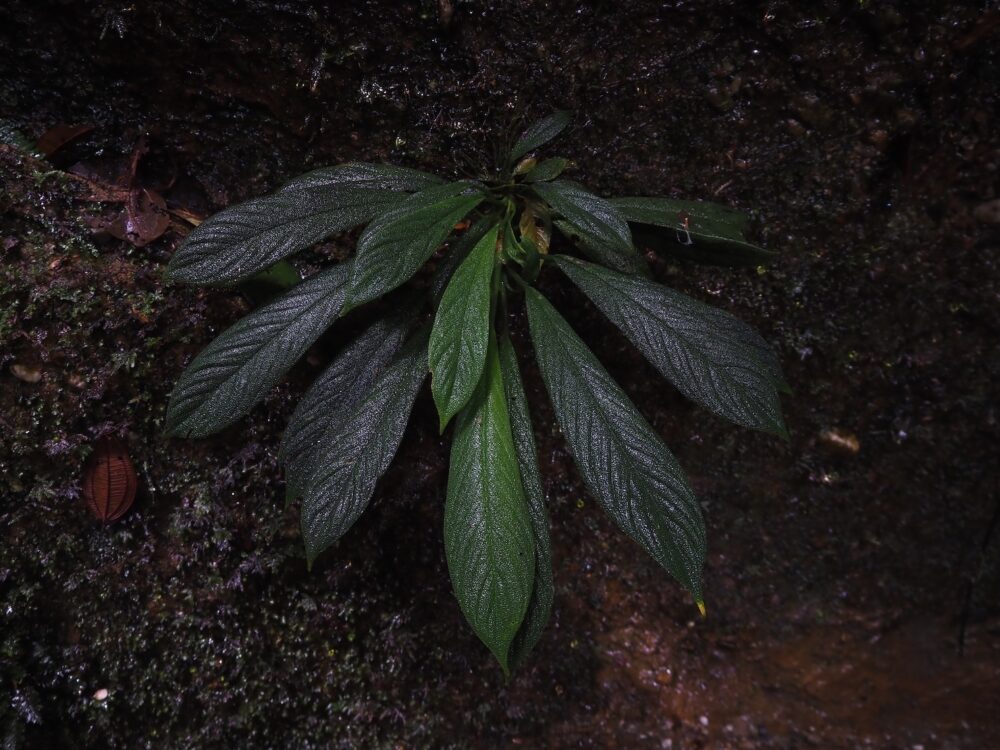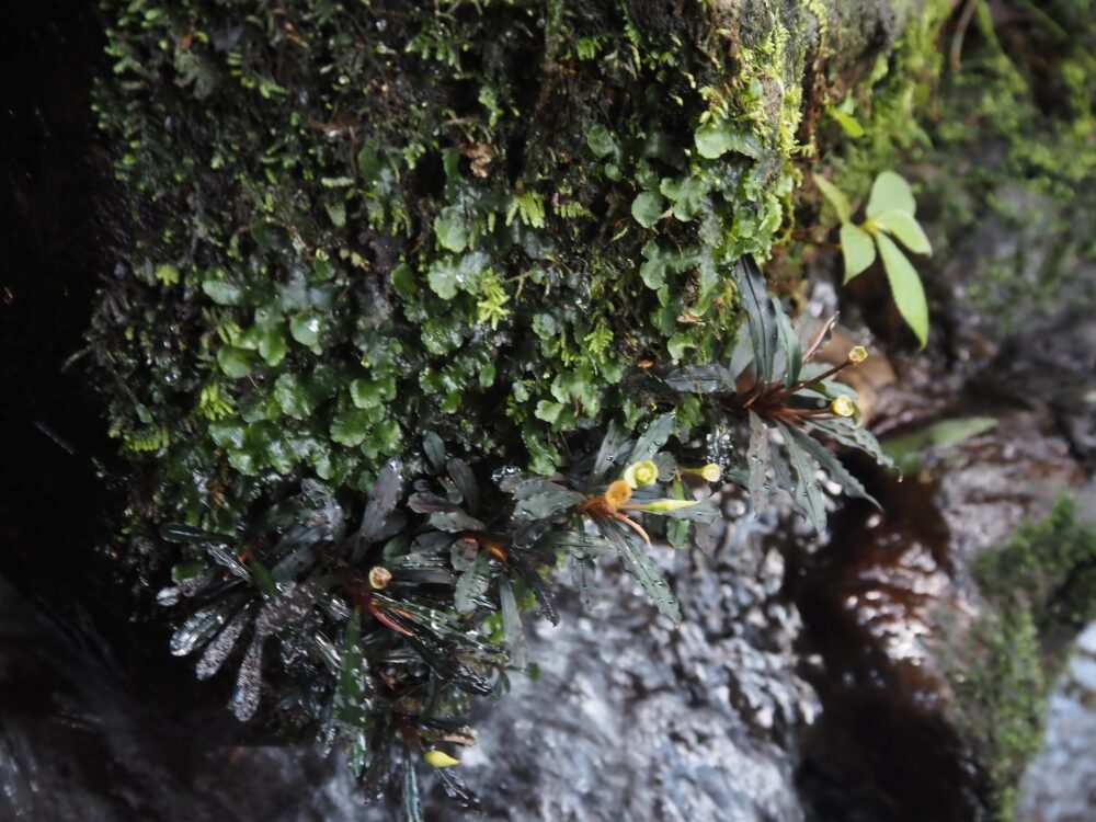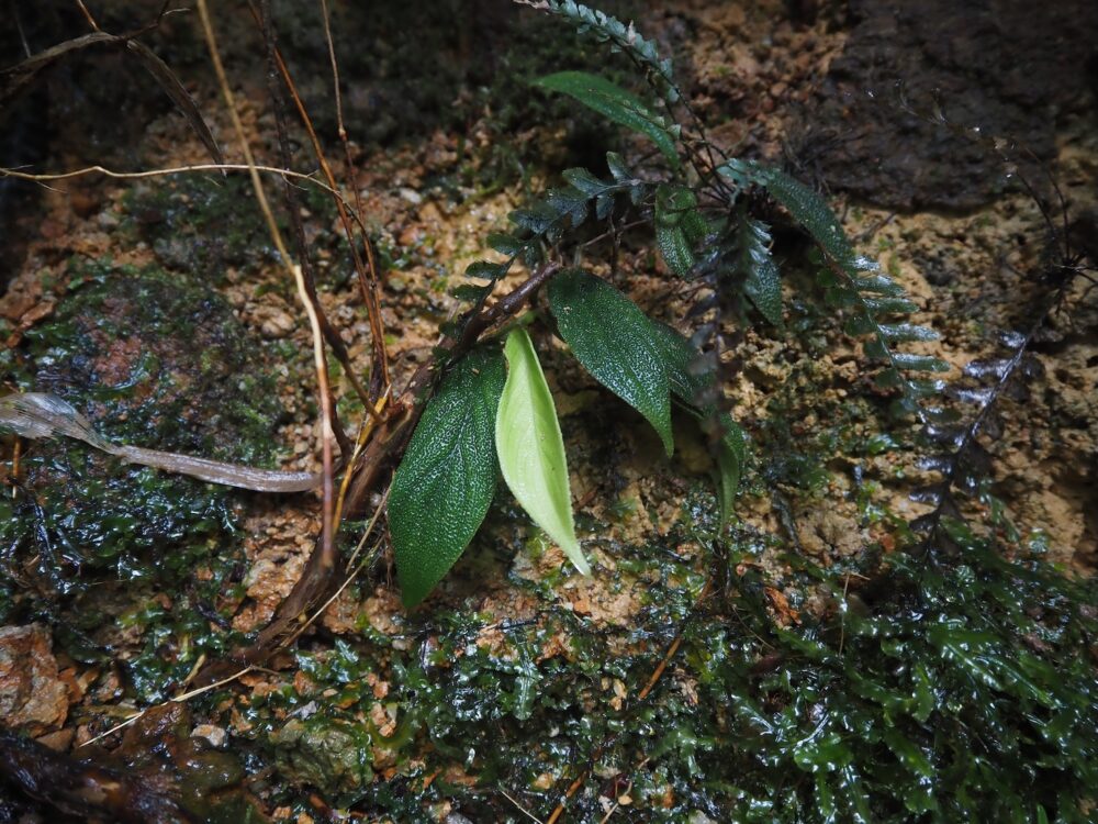 かなり暗くて湿度100%、でも風が抜けて昼間でも常に涼しい。岩盤はほぼ垂直で堆積物もほとんど無く、全面に水が染みている。この環境を見つけたら確実に変な植物を見つけれます。環境があまりにも特殊なのでそこに追い詰められて適応したごく一部の種類しか生存不可能。