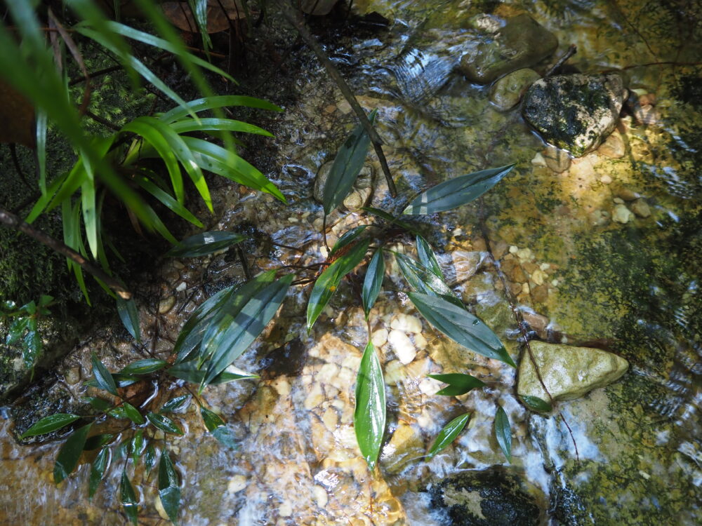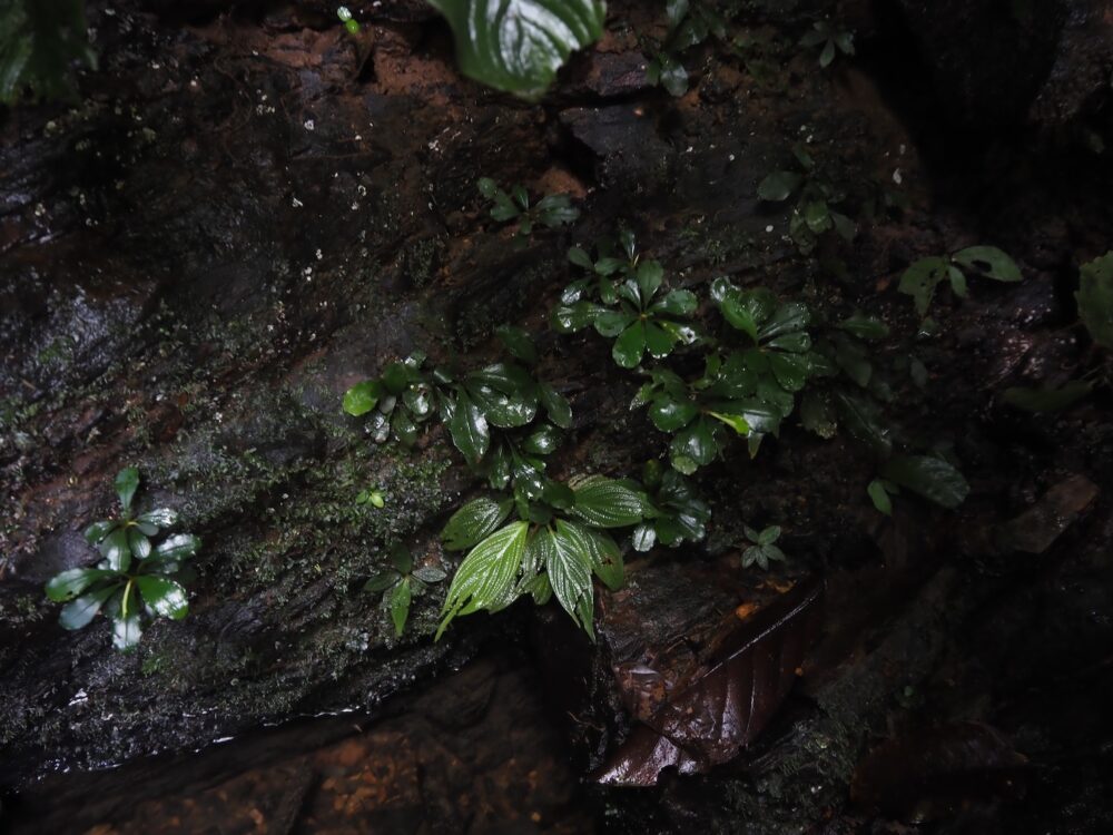 この環境では、植物にとっての最大の課題は「育つこと」よりもまず定着すること。雨季の増水で砂礫が動けば、根を下ろしたつもりでも簡単に流されるので渓流沿いの植物は“各種の最適な安全地帯”に集まります。例えば、岩の割れ目、転石の陰、倒木の裏側、板根の溝、落ち葉や枝が集まって土ができた小さな中洲のような場所。そういう場所が、生き残れる足場になります。