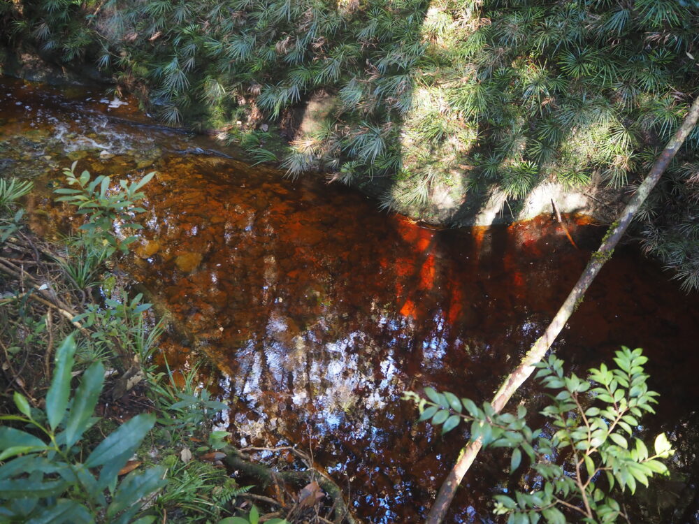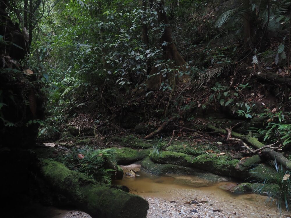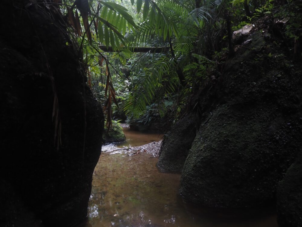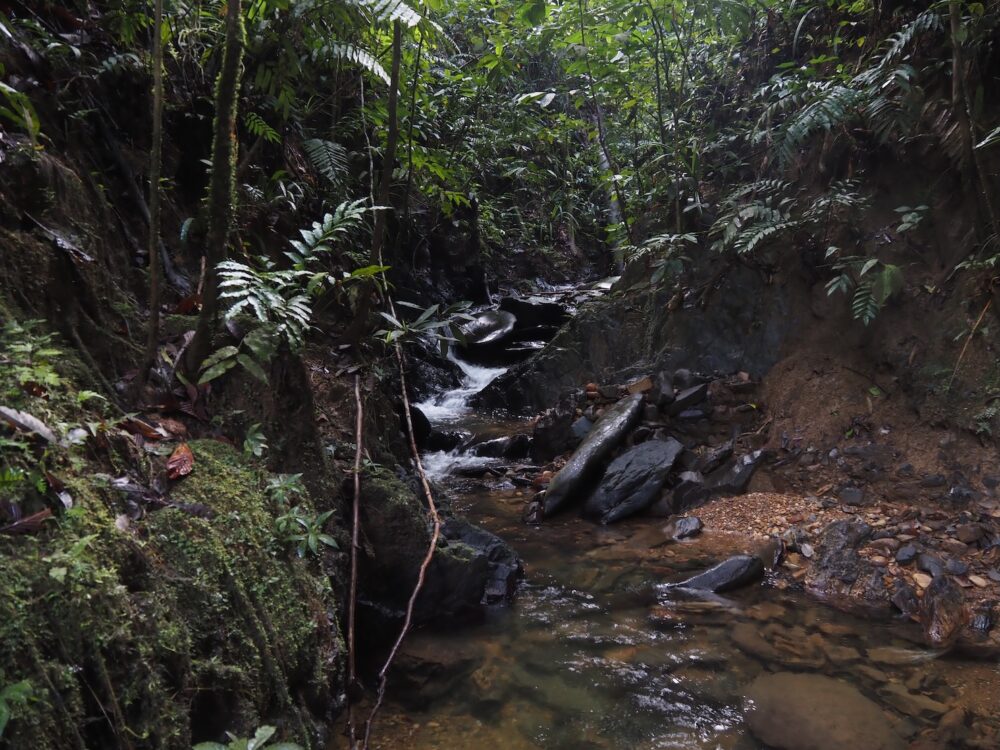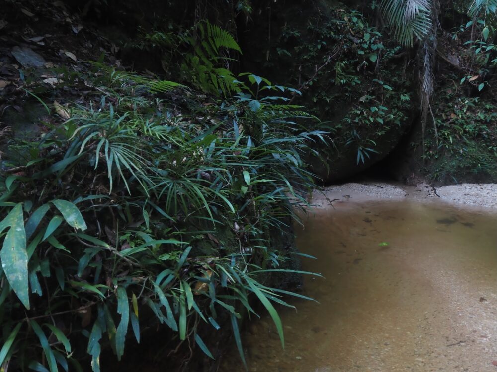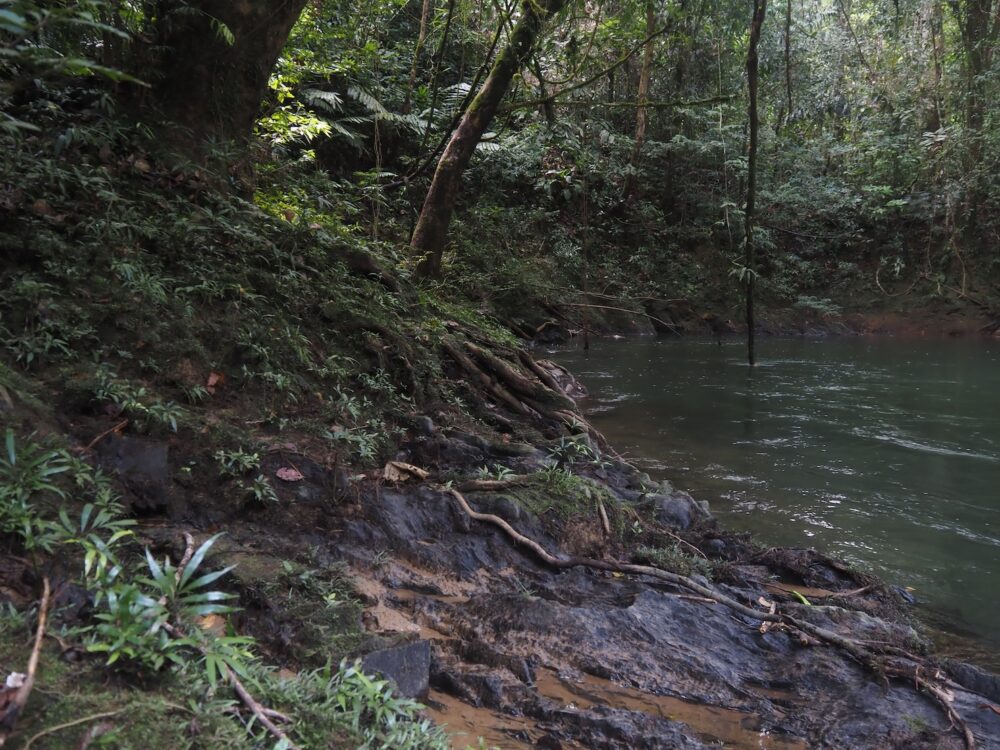 渓流沿いの林床は、熱帯ジャングルの足元の中でも特に動的な場所で、しっかり湿っていたり林冠が途切れて乾いていたり、増水で地面が洗われ、積もり、また削られるという更新が繰り返されています。数メートル歩くだけで足元の材質が「泥→砂→礫→岩→流木→落ち葉の島」と次々に切り替わります。時間を忘れてどんどん進んで行ってしまうジメ草沼ロードですね。