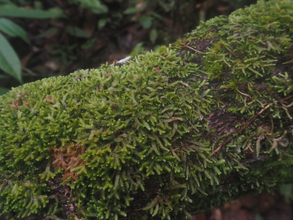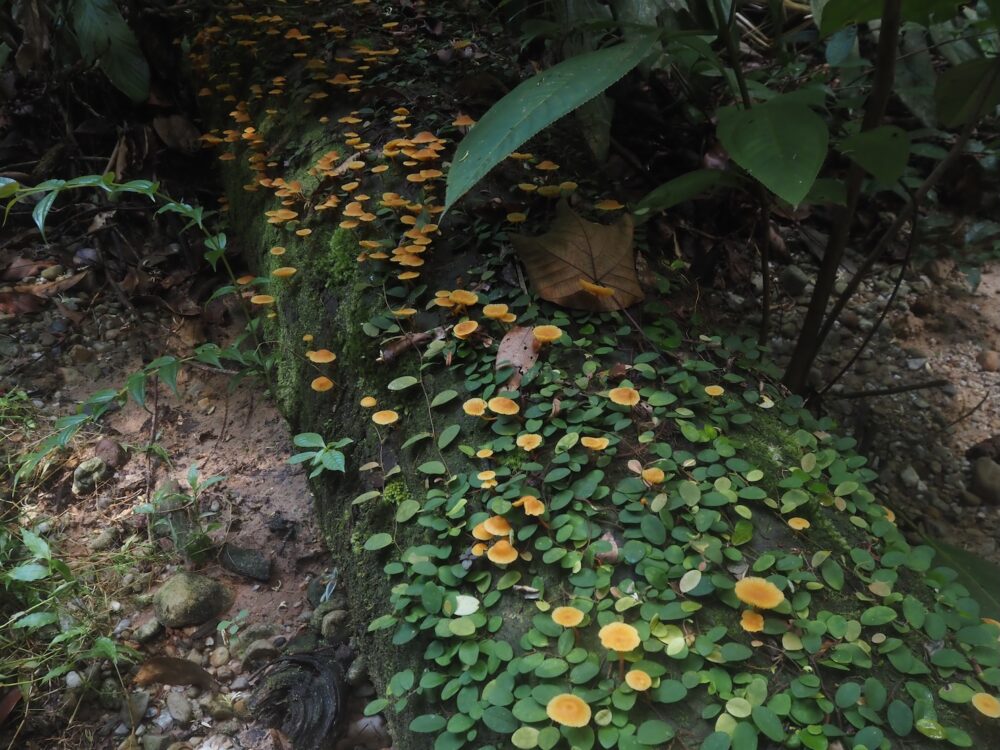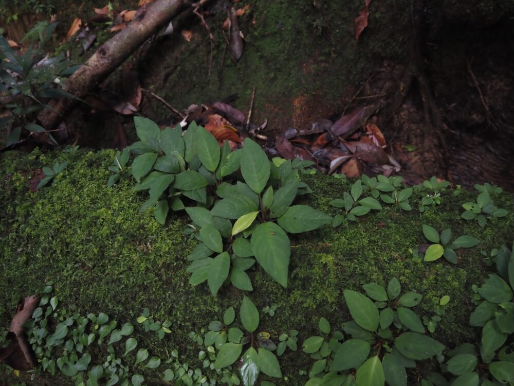 明るく比較的低湿度の環境ではキノコがいっぱい生えていたり、もう少し湿度が高まれば美しいライトグリーンの苔に覆われていたり、さらに暗くて高湿度になると苔マットからソネリラやアルゴステマなどの小型種が生息していたりします。ナースログごとにも色々な環境条件で植生が変化するのでおもしろポイントの一つです。