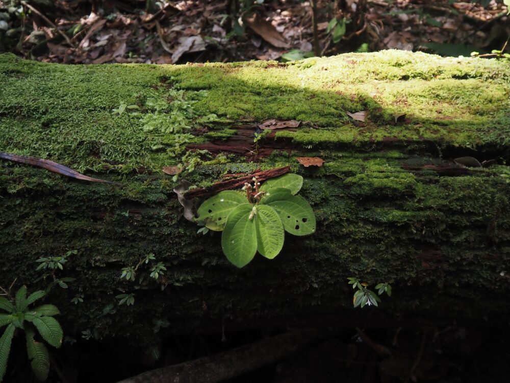 この倒木上の環境は物理的に高床式になっていて幼苗や小型種の避難所的な機能をしているように見えます。