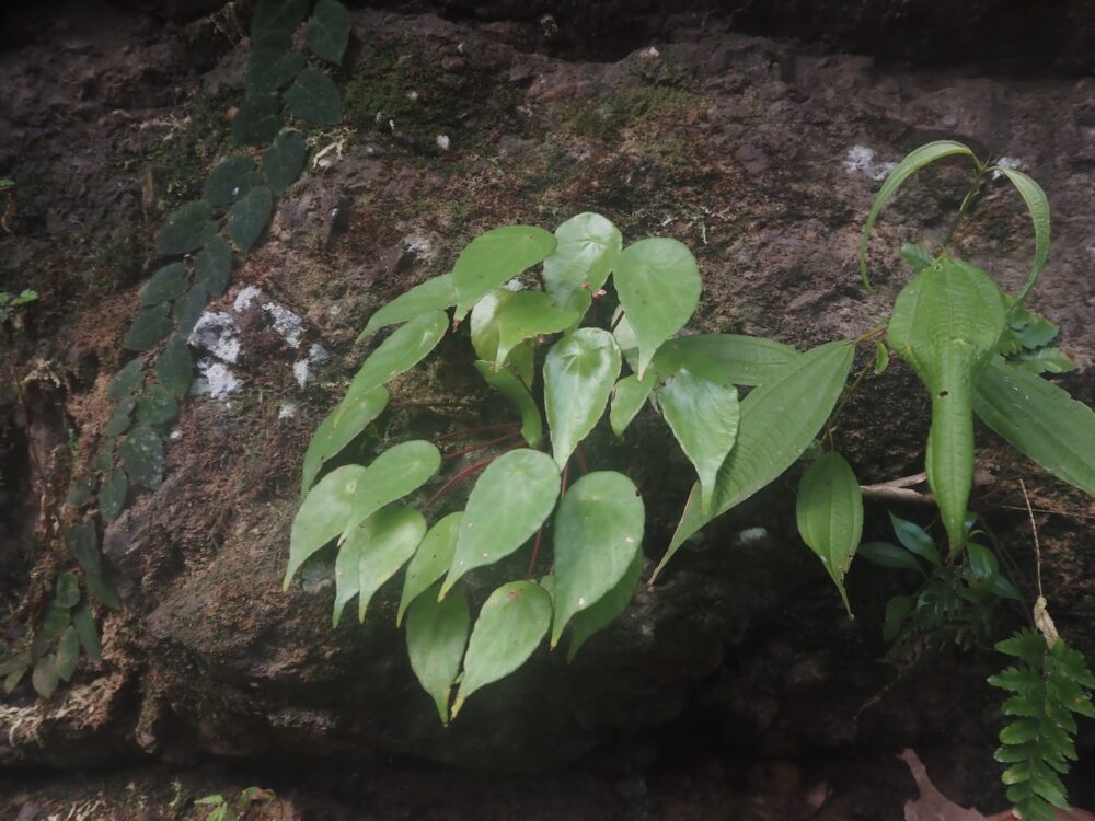 雨が降った直後はしっとりしていても、日が差したり風が抜けたりすると一気に乾く。つまり、岩の上は「乾湿」の振れ幅が大きい。こう言う環境ではベゴニアやイワタバコの仲間のテリトリーになっていることが多いです。または、岩の凹みに落ち葉や岩肌を流れてきた水が溜まり小さな土の壺のような場所ができて、そこが周辺とは全く異なるHomalomenaのオアシスのようになることもあります。