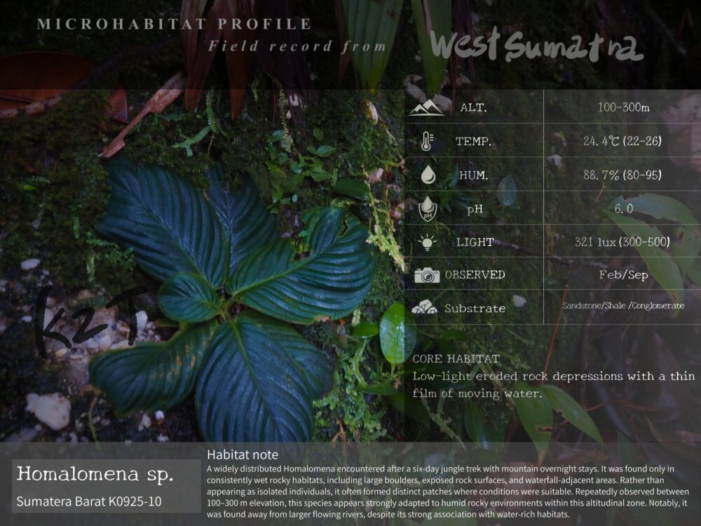 ジャングルを山中泊しながら6日間歩いた先で出会ったHomalomenaです。自生地は、非常に水気の多い大岩や岩盤、さらに滝の近くなど、豊富な水環境が連続する場所に限って広く分布していました。局地的に点在するというより、条件の合う地形ではまとまったパッチを各所に形成しており、標高100〜300mの範囲内で繰り返し確認されたことから、この帯の湿潤な岩場環境に強く適応した種類と考えられます。豊かな水に支えられた立地で存在感を見せる、広域分布型のHomalomenaです。