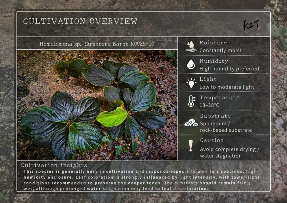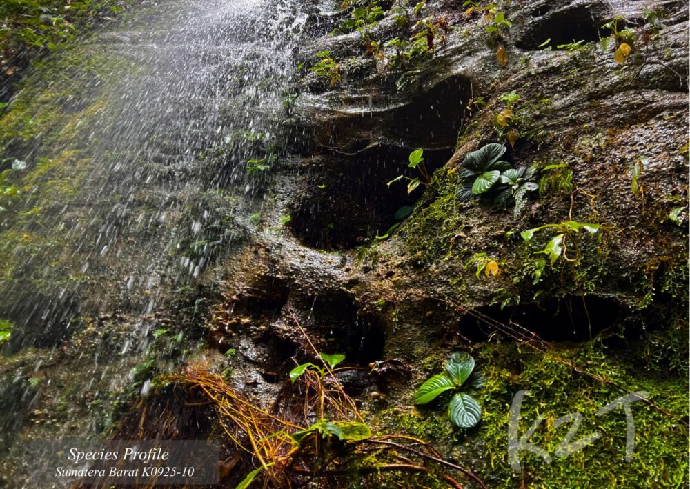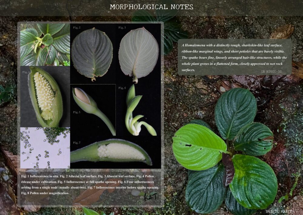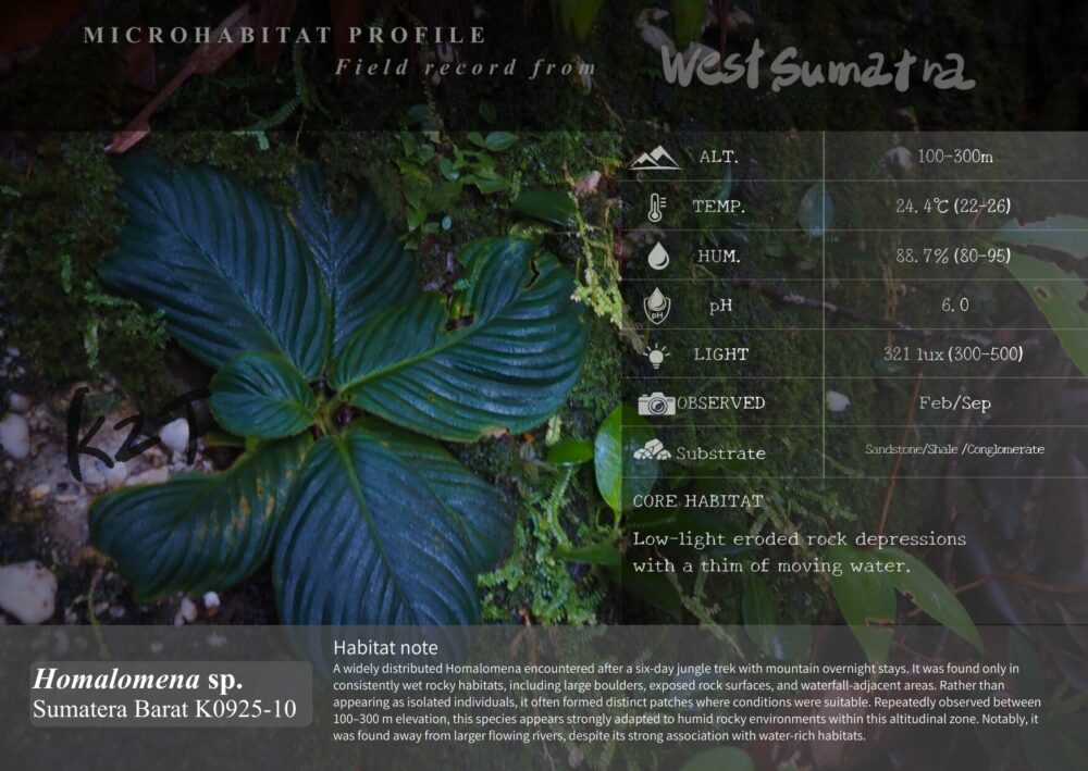 ジャングルを山中泊しながら6日間歩いた先で出会ったHomalomenaです。自生地は、非常に水気の多い大岩や岩盤、さらに滝の近くなど、豊富な水環境が連続する場所に限って広く分布していました。局地的に点在するというより、条件の合う地形ではまとまったパッチを各所に形成しており、標高100〜300mの範囲内で繰り返し確認されたことから、この帯の湿潤な岩場環境に強く適応した種類と考えられます。豊かな水に支えられた立地で存在感を見せる、広域分布型のHomalomenaです。
