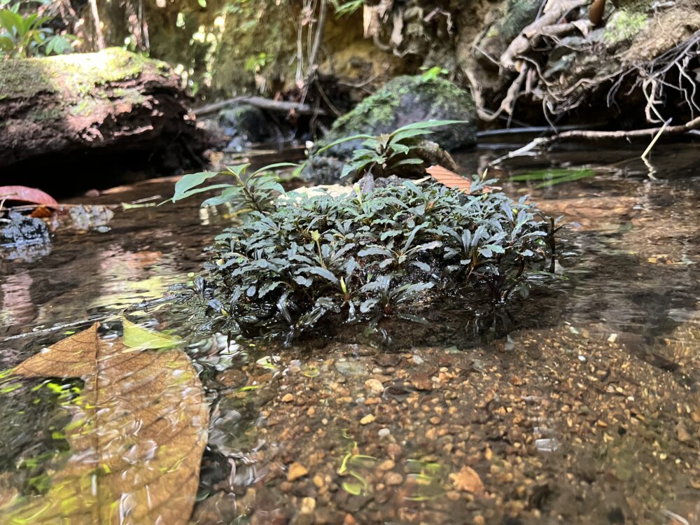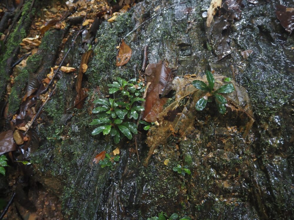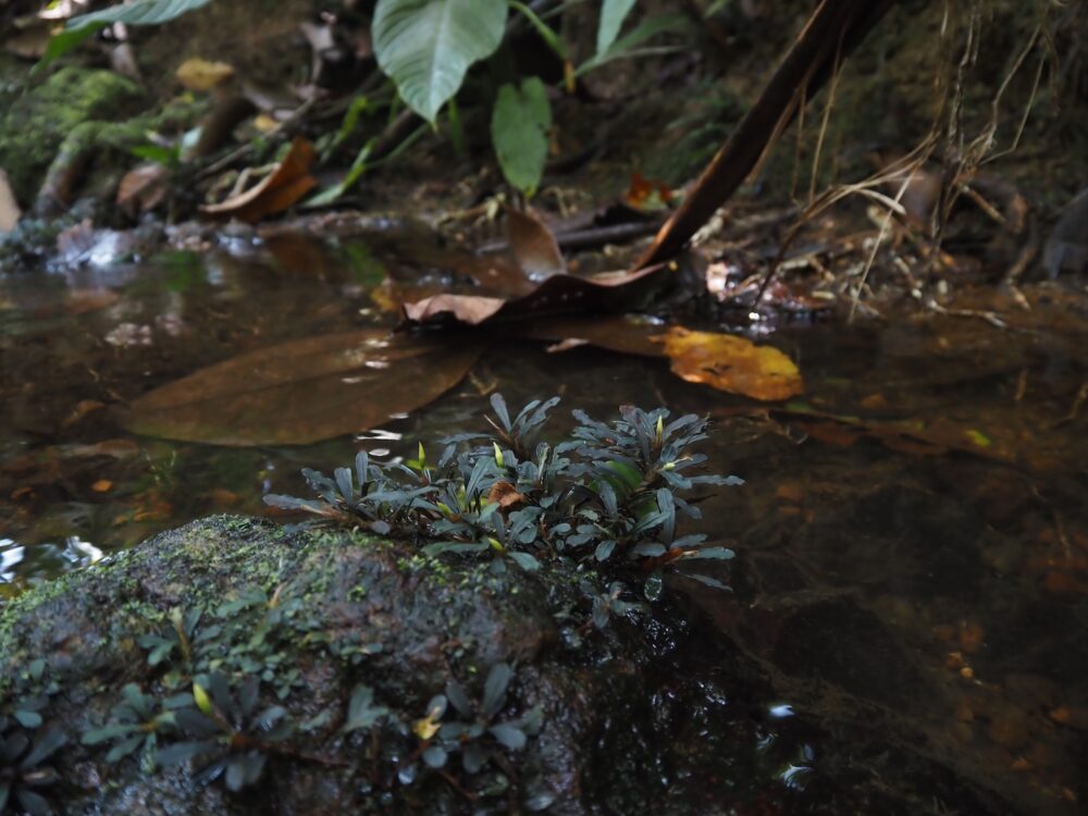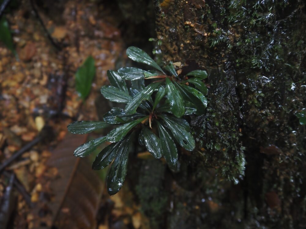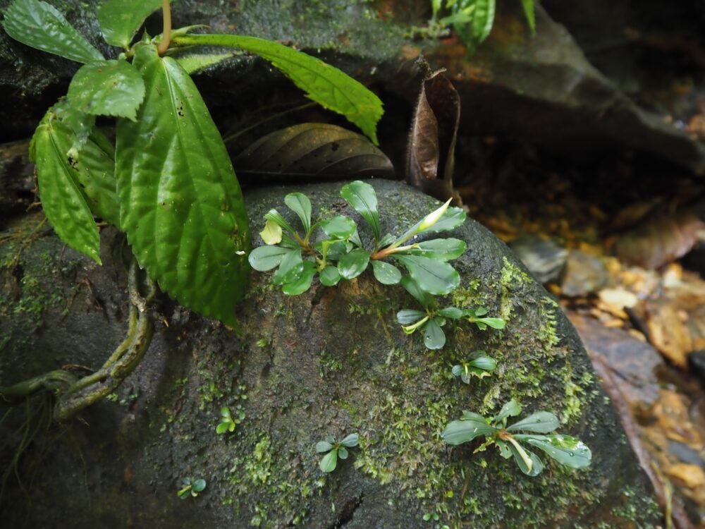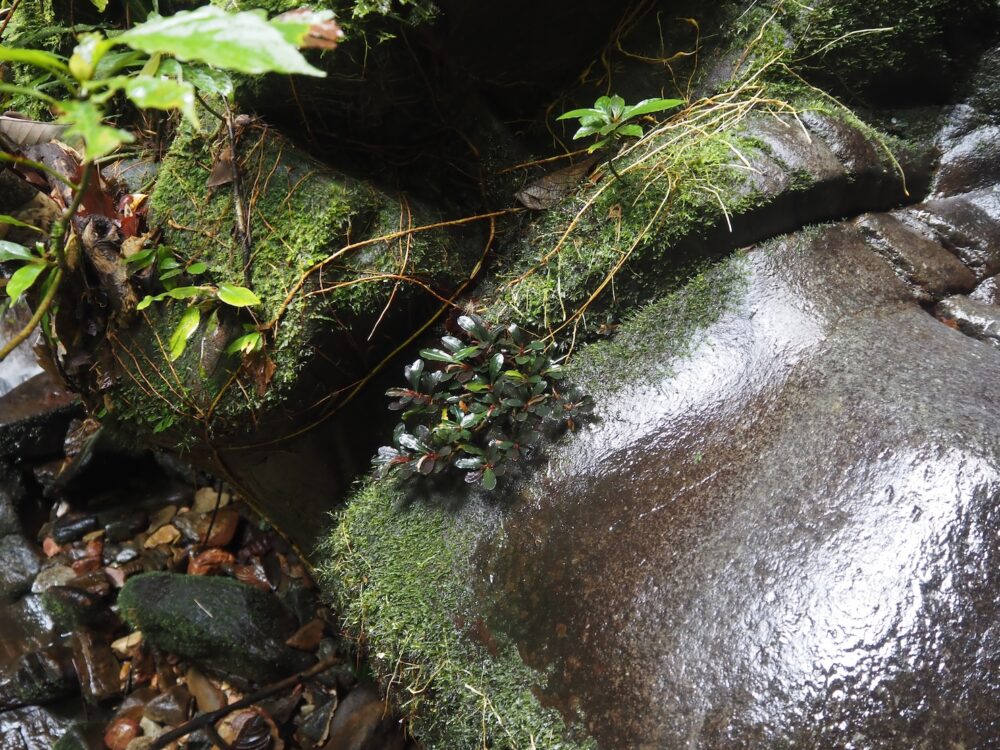 ジャングルの樹冠に覆われた、岩盤が露出する渓流に沿って自生を確認。この時入ったの支流のほぼ全ての場所で群生。