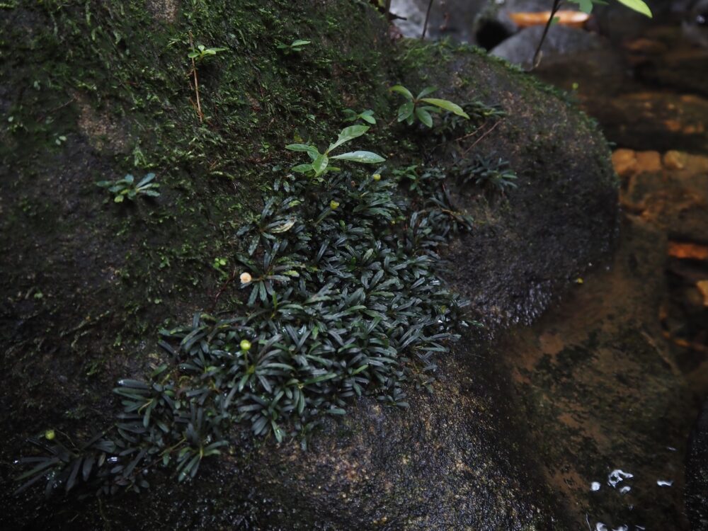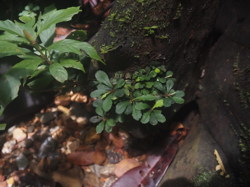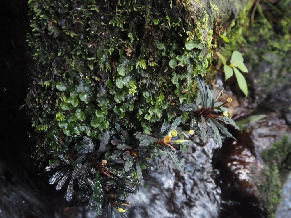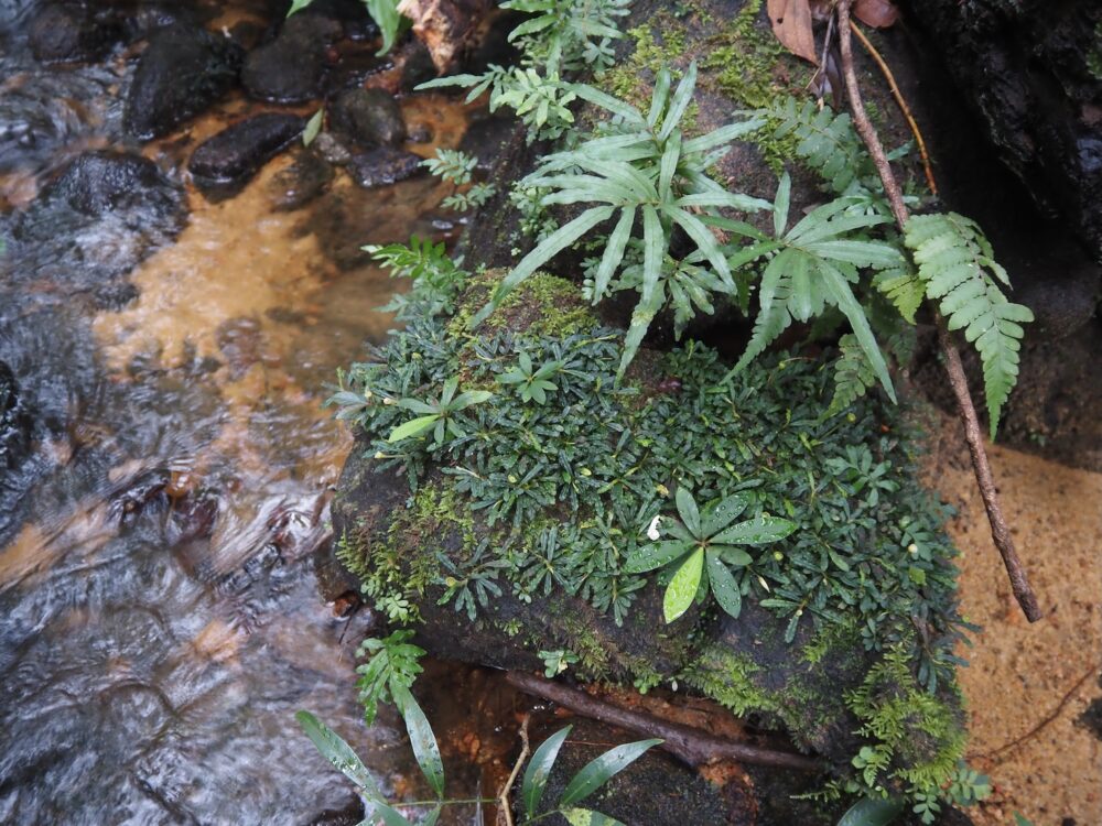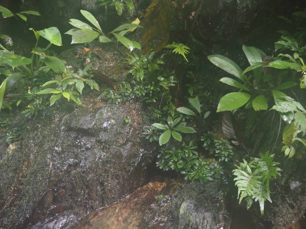 ジャングルの樹冠に覆われた、岩盤が露出する渓流に沿って自生を確認。この時入ったの支流のほぼ全ての場所で群生。