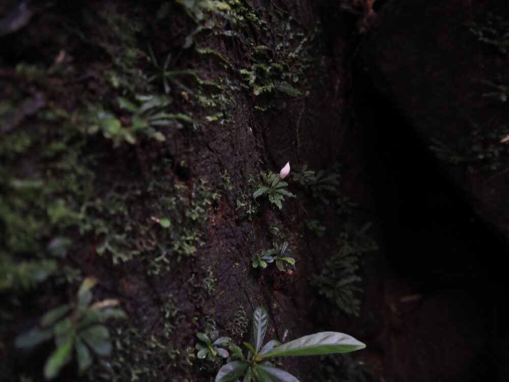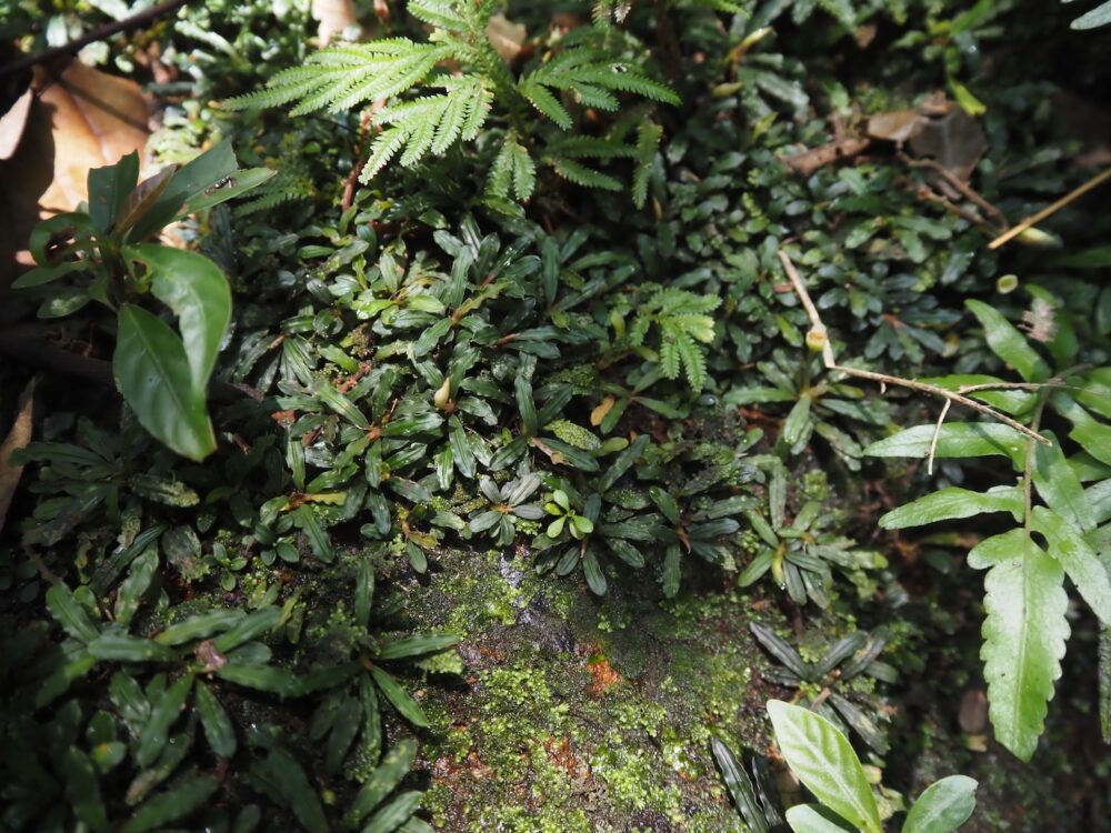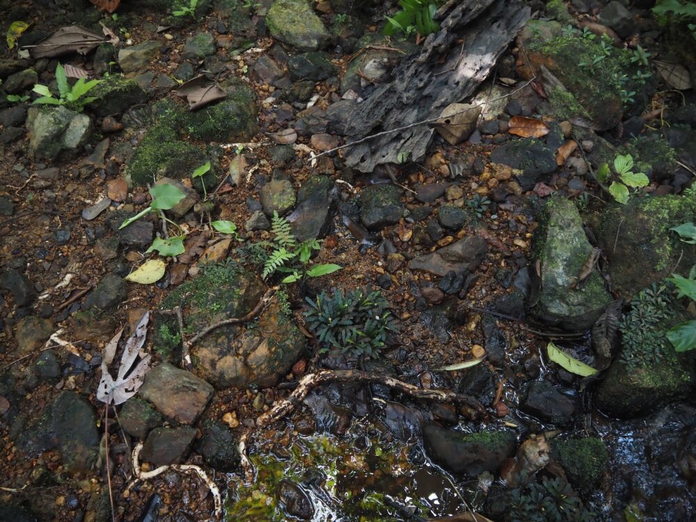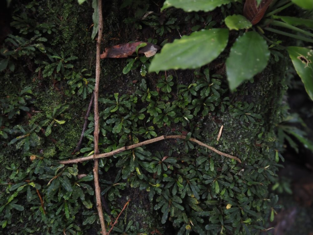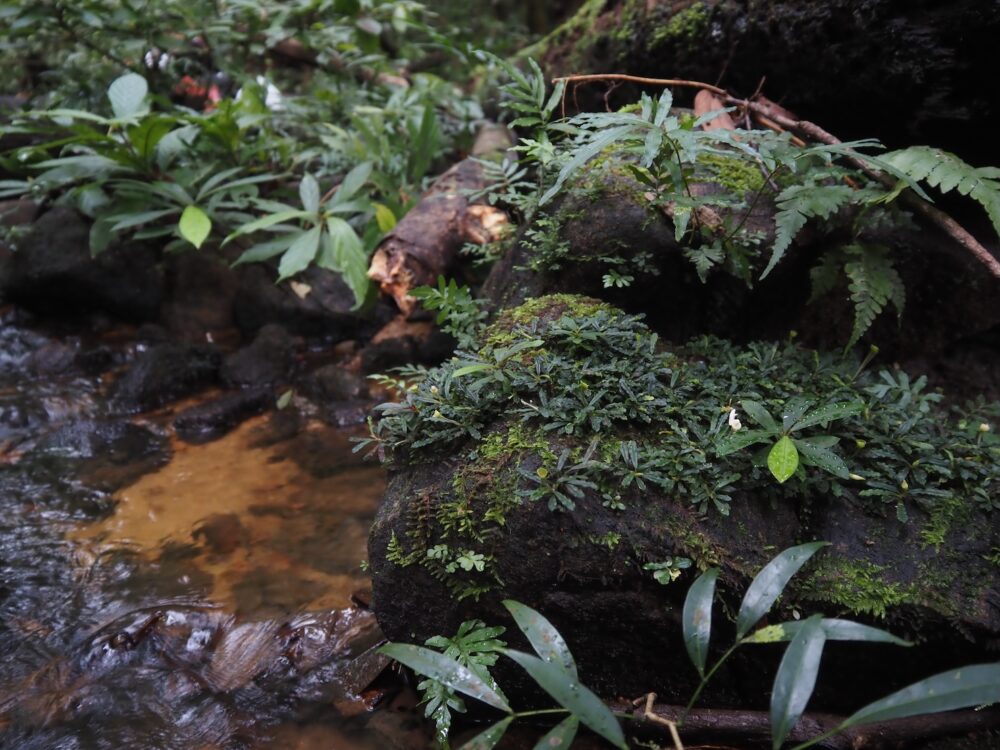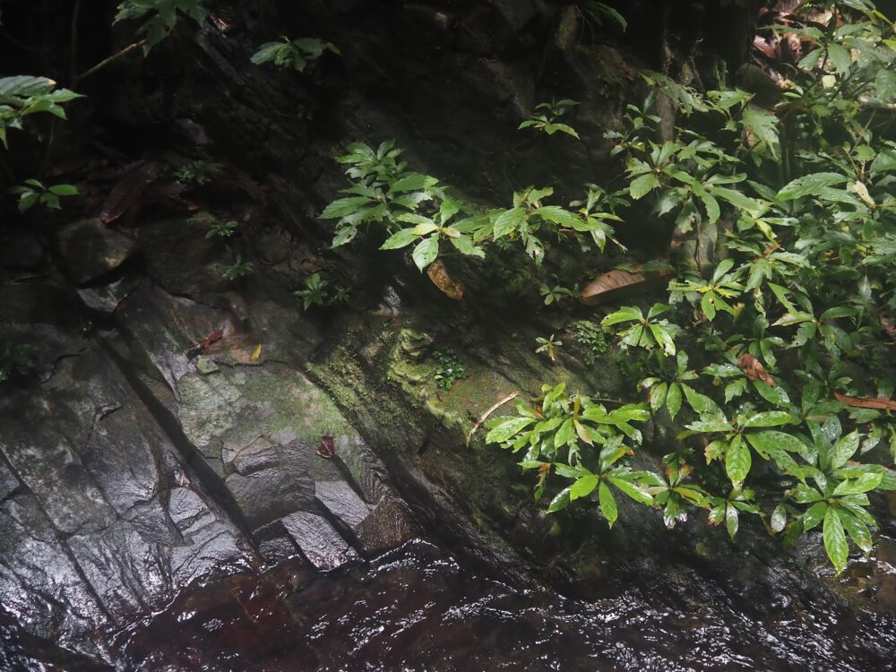 ジャングルの樹冠に覆われた、岩盤が露出する渓流に沿って自生を確認。この時入ったの支流のほぼ全ての場所で群生。