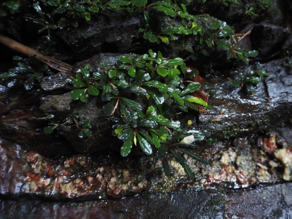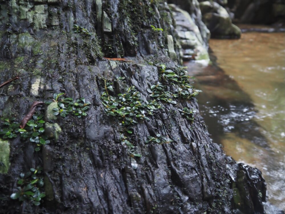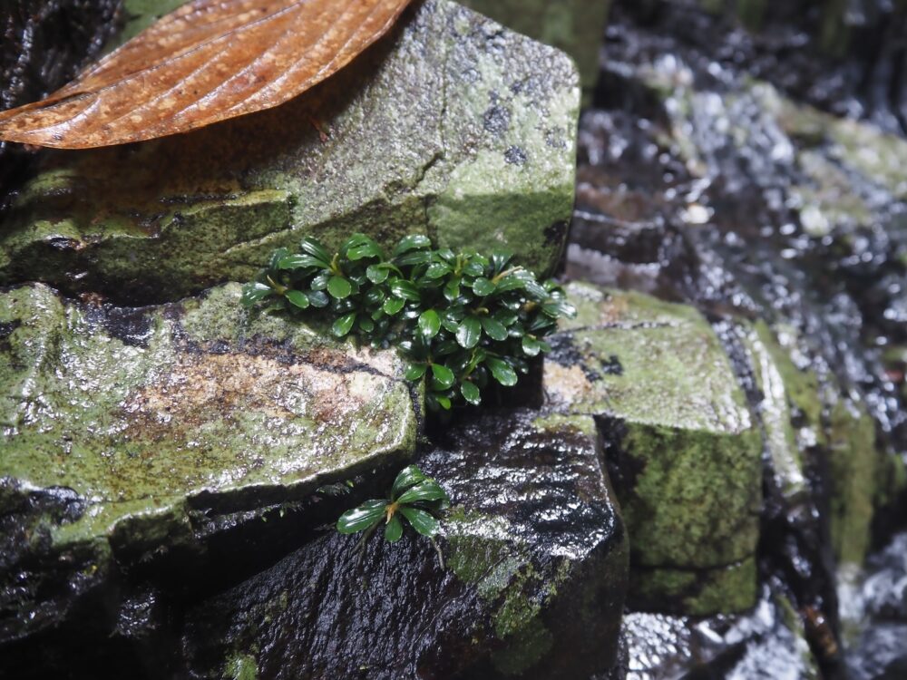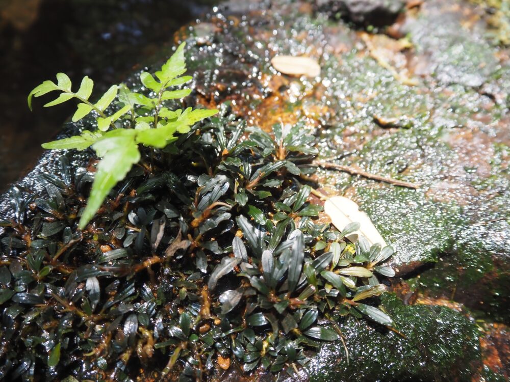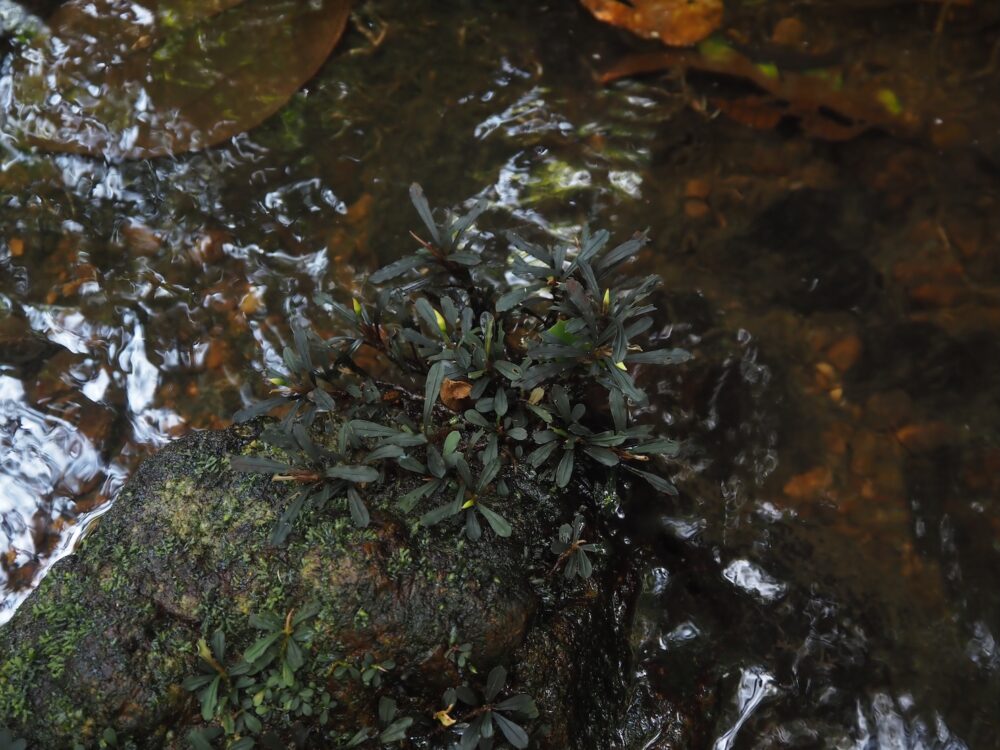 一つの支流には複数種が場所ごとに群生し、別の支流ではまた異なる種類の組み合わせが。どこでも水面から約1 m前後の範囲内の岩盤に直接張り付くように生育。
