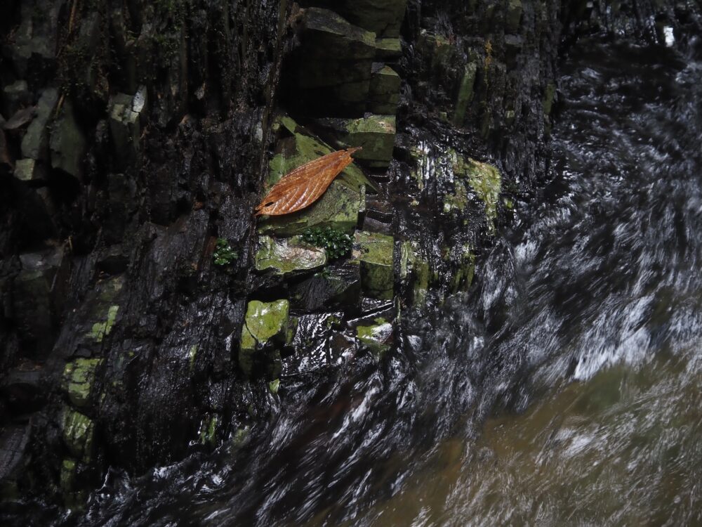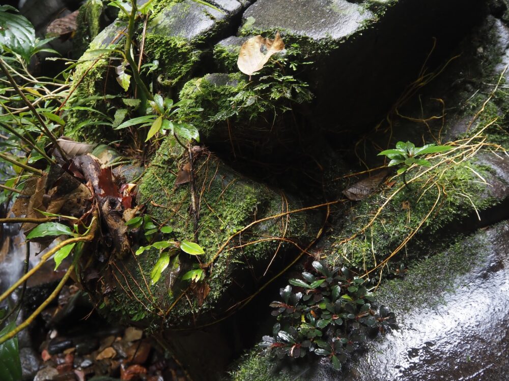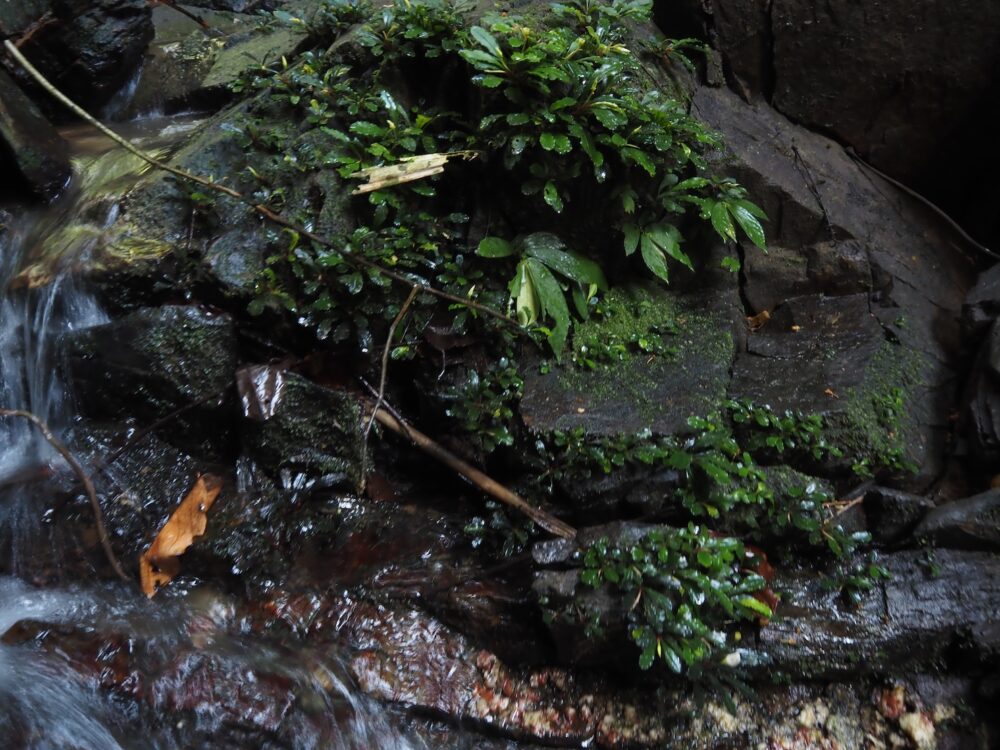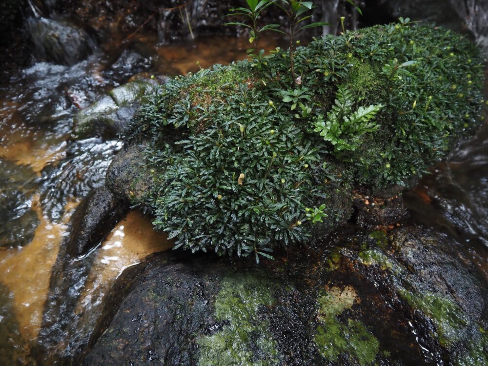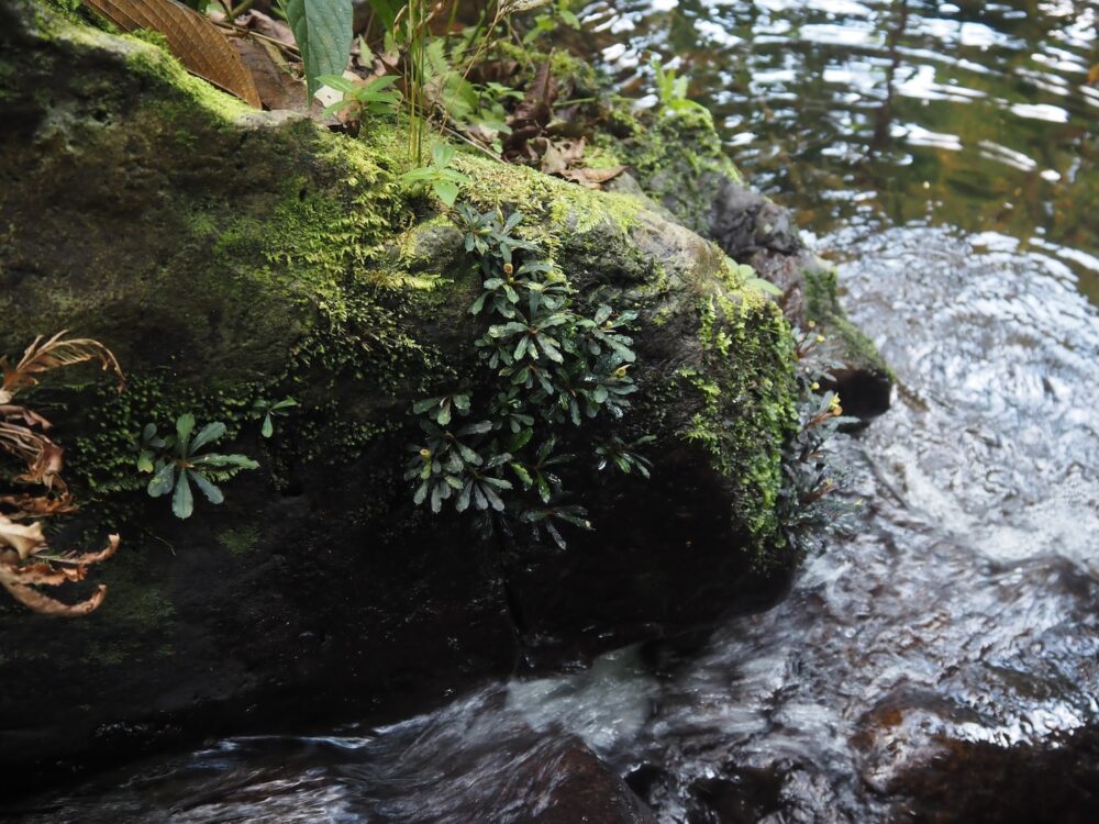 一つの支流には複数種が場所ごとに群生し、別の支流ではまた異なる種類の組み合わせが。どこでも水面から約1 m前後の範囲内の岩盤に直接張り付くように生育。